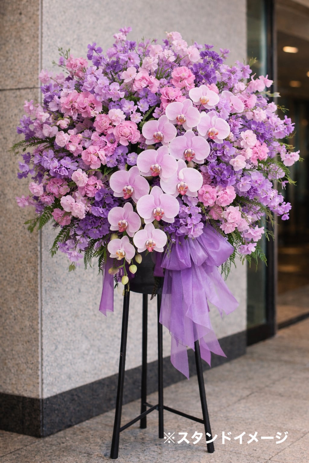 グループのモチーフフラワー【胡蝶蘭】とライブのテーマフラワー【スイートピー】をふんだんに使用したスタンド花となります。(2枚目)